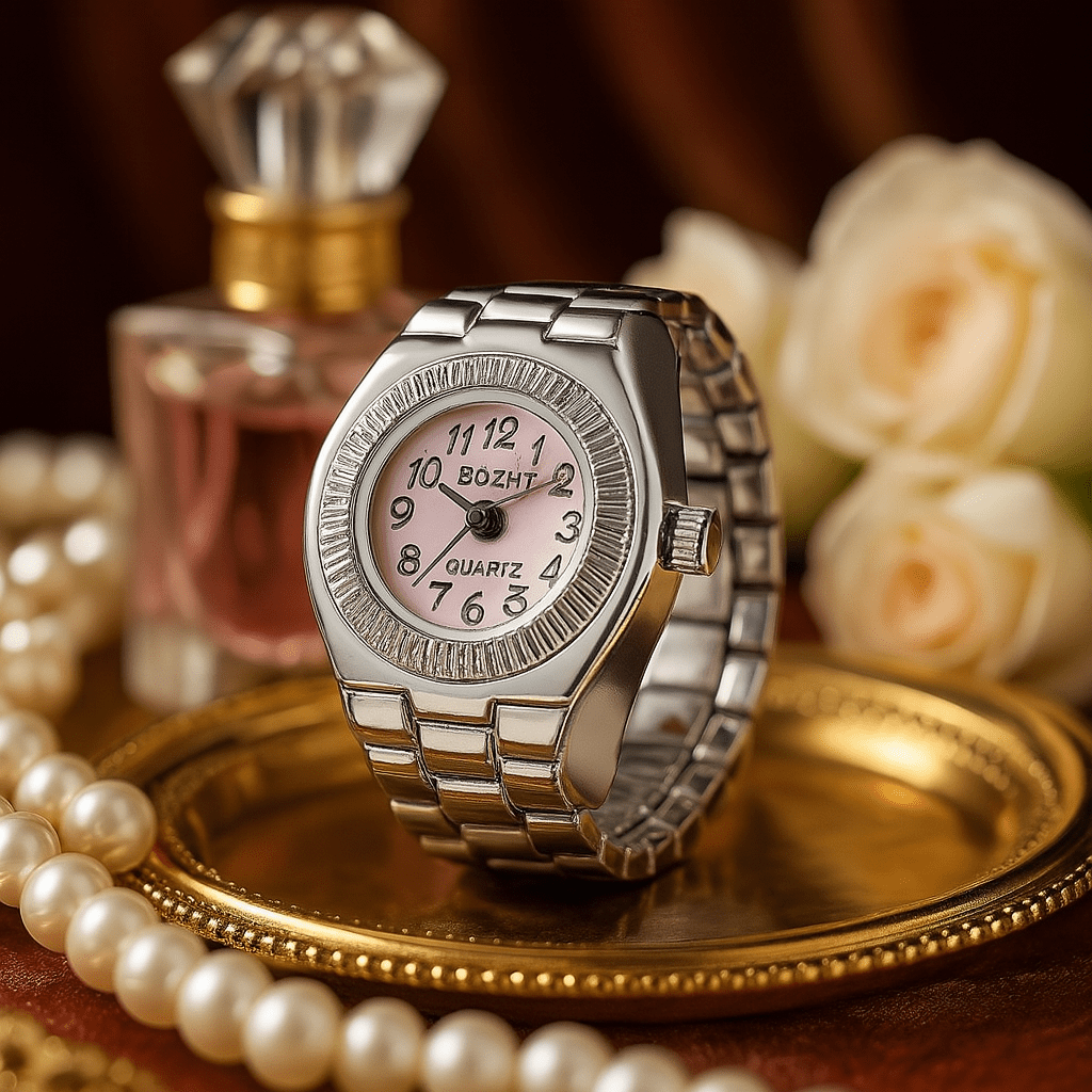 ساعت انگشتری نقره ای گرد صفحه صورتی کد RW-127
